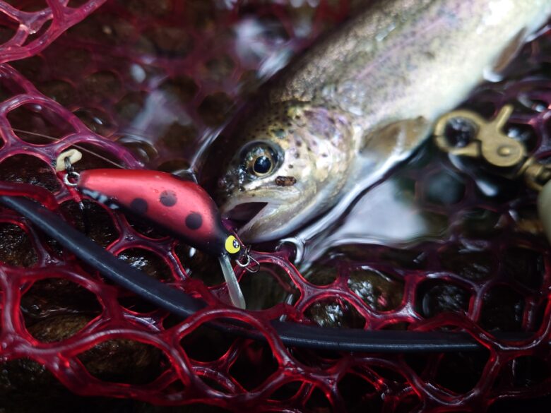 犀川殖産にて、チビですがギンピカレインボーを釣りました。